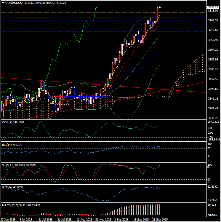 日足チャートでは、9月に入ってから力強い上昇トレンドが続き、3835ドルのレジスタンスライン(赤点線)に到達しました🌟