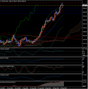 ゴールド 相場分析 10月3日の展望です。金価格(XAU/USD)は直近で3870ドル台まで上昇後、高値圏でのもみ合いが続いています。長期的には強い上昇トレンドを維持していますが、短期的にはRSIやストキャスティクスの過熱感が見られ、調整局面への警戒も必要です💡