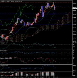 1時間足では、3850〜3880ドルのレンジで上下動を繰り返しています。直近は雲の中に入り方向感を欠いており、短期トレーダーにとっては難しい局面です。CCIはフラット、RSIも48付近でニュートラルを示し、直近は明確な方向感が出にくい環境です。ATRが低下しており、ボラティリティ縮小後の次の動きに注目が集まります👀。