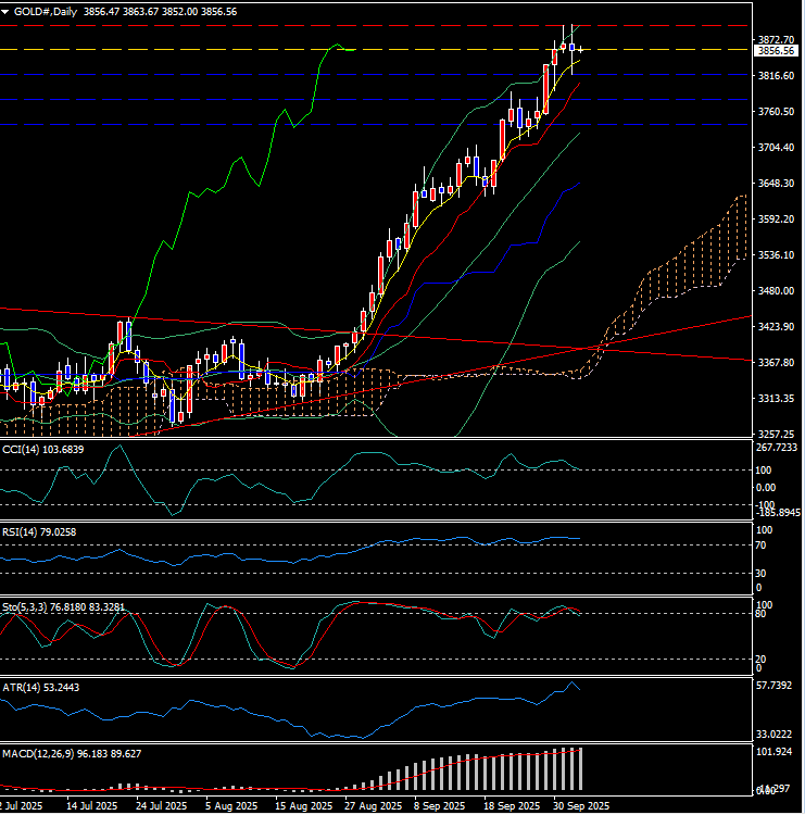 ゴールド 相場分析 10月3日の展望です。金価格(XAU/USD)は直近で3870ドル台まで上昇後、高値圏でのもみ合いが続いています。長期的には強い上昇トレンドを維持していますが、短期的にはRSIやストキャスティクスの過熱感が見られ、調整局面への警戒も必要です💡
