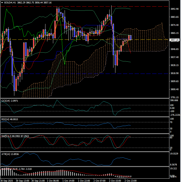 1時間足では、3850〜3880ドルのレンジで上下動を繰り返しています。直近は雲の中に入り方向感を欠いており、短期トレーダーにとっては難しい局面です。CCIはフラット、RSIも48付近でニュートラルを示し、直近は明確な方向感が出にくい環境です。ATRが低下しており、ボラティリティ縮小後の次の動きに注目が集まります👀。