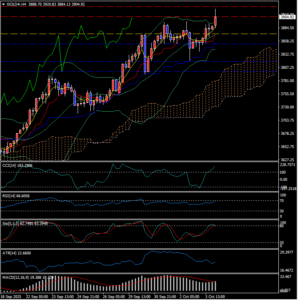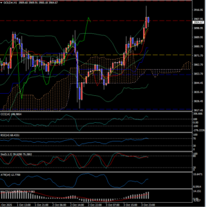 4時間足では、3900ドルを試したあと上ヒゲを残し、やや調整ムードが出ています。