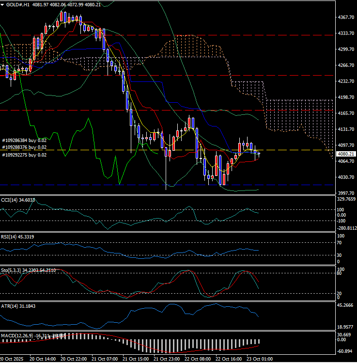 → 転換線・雲下限突破で短期反発狙い。ターゲットは4170ドル付近。