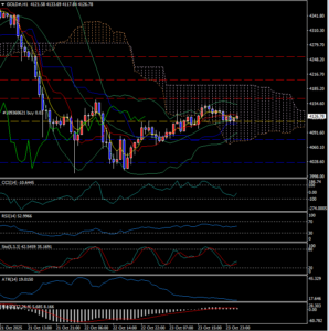 4時間足では下落後のリバウンドが進行中で、現在は一目均衡表の雲下限(約4170ドル)付近で攻防が続いています。