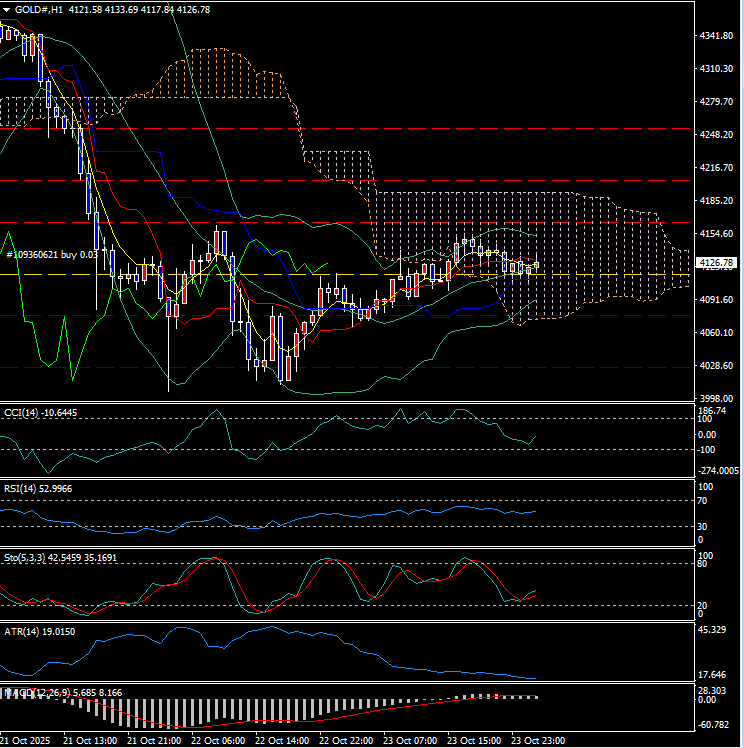 1時間足ではローソク足が**一目均衡表の雲の中(4120〜4160ドル)**にあり、