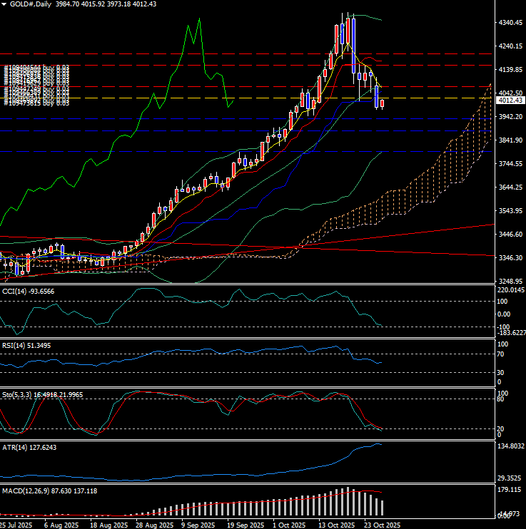 日足チャートでは、ゴールド(XAU/USD)は3980~4010ドル台で下げ止まりを試す動きです。