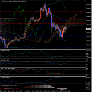 日足では4050〜4100ドルのレンジが続き、ローソク足は雲上限に支えられながらも上値が重い展開です。